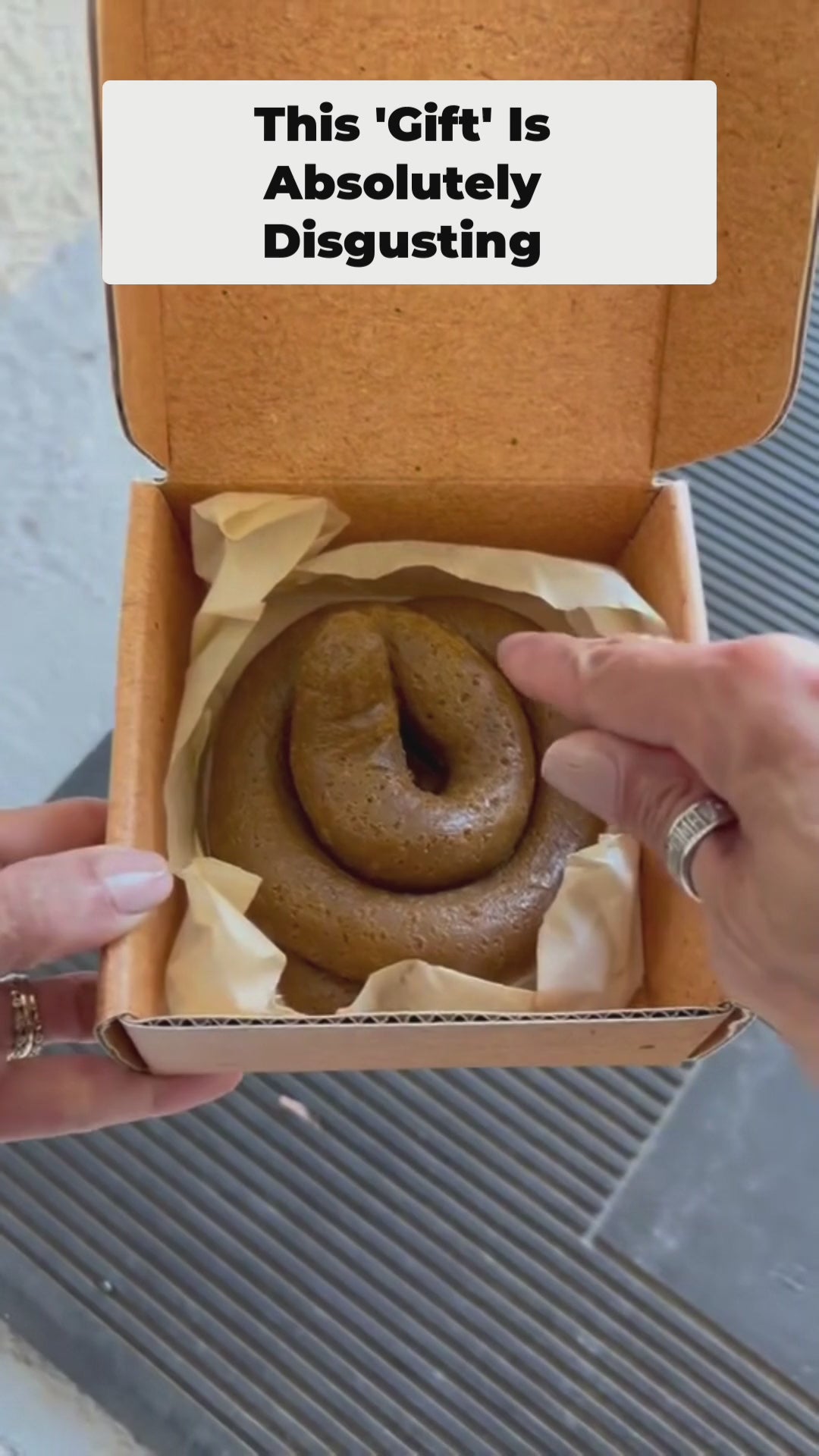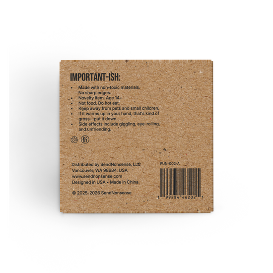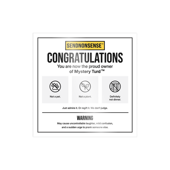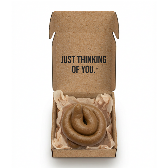 The gift they’ll never forget (no matter how much they want to). It looks like a thoughtful present — kraft box, tissue paper, neat little details. But inside? A large, disturbingly realistic turd. Unwrap. Stare. Question your friendships. The inside lid even says: “Just thinking of you.”